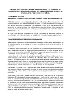 La technique CH-CBSC, dite usuellement « mono-cône », ne nécessite pas d'outils de compactage intra-canalaire de lagutta-percha. De ce fait elle est plus simple, plus rapide de mise en œuvre,...Voir toutes les publications
