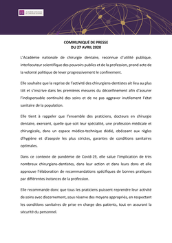 L’Académie nationale de chirurgie dentaire, reconnue d’utilité publique, interlocuteur scientifique des pouvoirs publics et de la profession, prend acte de la volonté politique de lever progressivement le confinement.