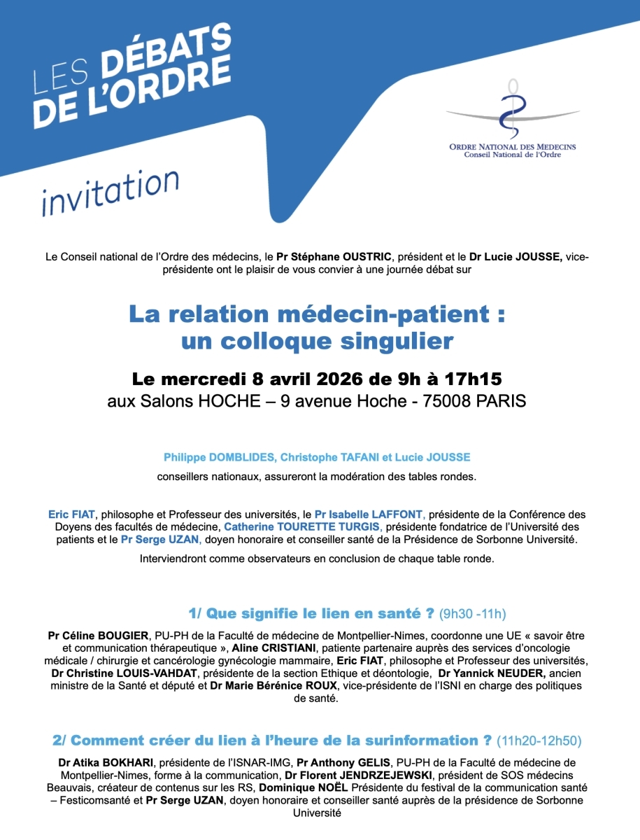 Le Conseil national de l'Ordre des médecins, le Pr Stéphane OUSTRIC, président et le Dr Lucie JOUSSE, vice-présidente ont le plaisir de vous convier à une journée débat sur la relation médecin-patient.