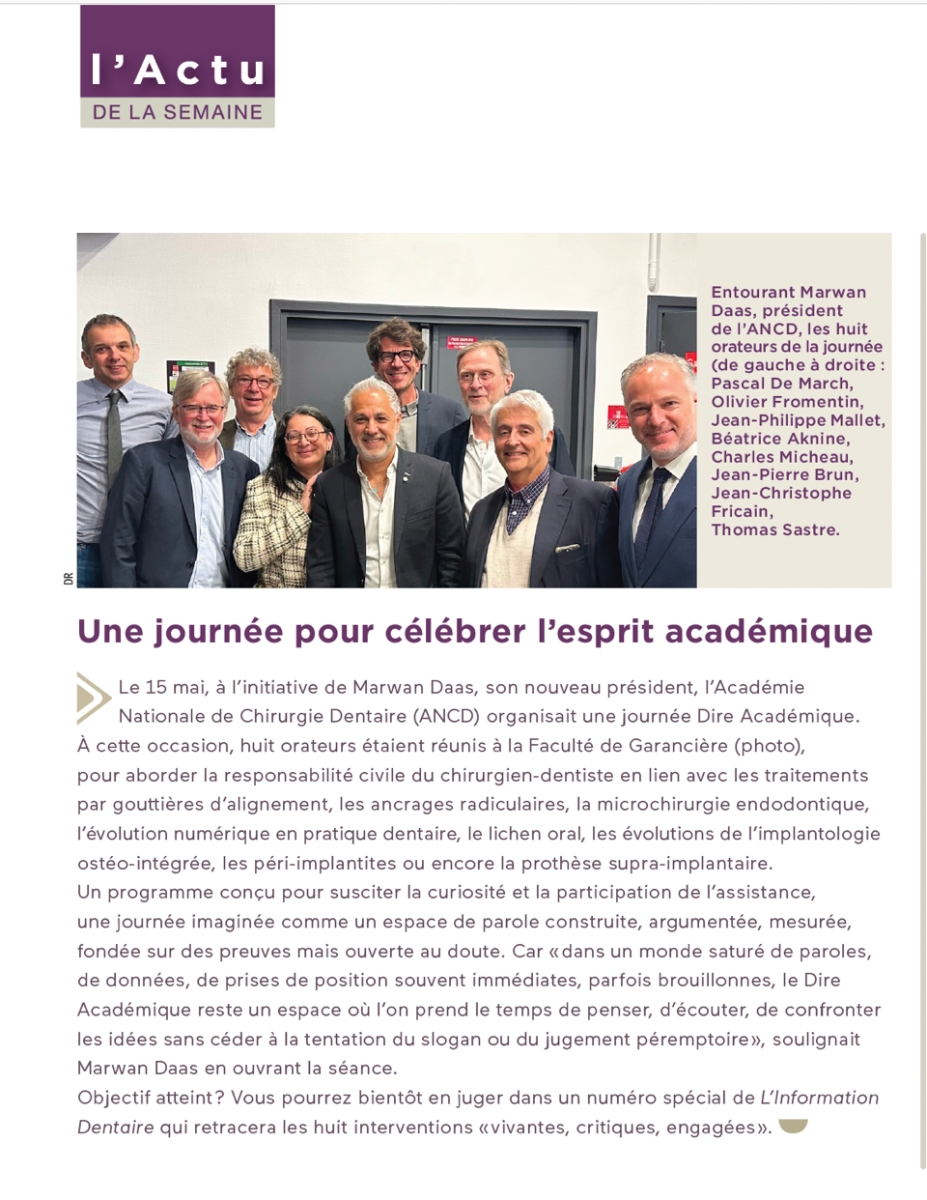 Lire ci-dessous l'article paru dans l'Information Dentaire n° 21/22 du 28 mai 2025 : « Une journée pour célébrer l'esprit académique »