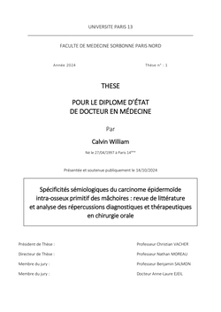 Spécificités sémiologiques du carcinome épidermoïde intra-osseux primitif des mâchoires : revue de littérature et analyse des répercussions diagnostiques et thérapeutiques en chirurgie orale.
