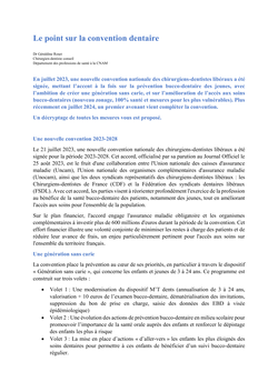 En juillet 2023, une nouvelle convention nationale des chirurgiens-dentistes libéraux a été signée, mettant l'accent à la fois sur la prévention bucco-dentaire des jeunes, avec l'ambition de créer une génération sans carie, et sur l'amélioration de l'accès aux soins bucco-dentaires (nouveau zonage, 100% santé et mesures pour les plus vulnérables).